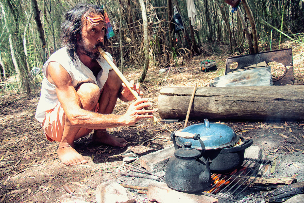 FOTO 5 «PAPACHO»: Tomada en Punta del Diablo, Uruguay. Sergio es una persona que todo el mundo tiene que conocer. Un sabio, otro buscador. A los 45 años comenzó a interesarse por los instrumentos musicales. Hoy es un excelente luthier. Vive gracias a los instrumentos exóticos que el y su mujer hacen, vive del aire, de los arboles, del amor propio.. Es un pájaro.